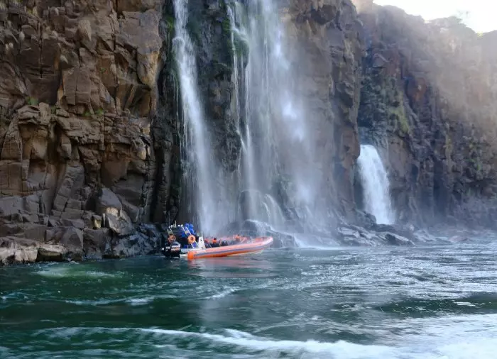 Første del av turen går med 4WD-buss gjennom jungelen på en 5 km grusvei ned til havnen. Herfra går det en bratt trapp ned til havnen, der en speedbåt venter for å ta deg med oppover elven mot de brølende og brusende vannfallene.
