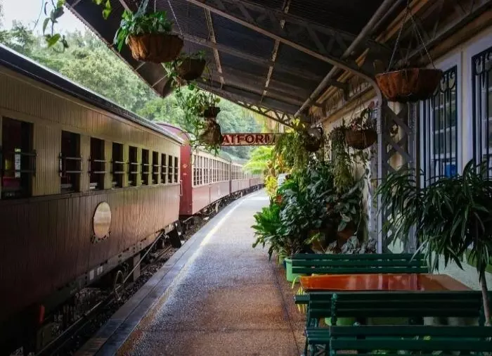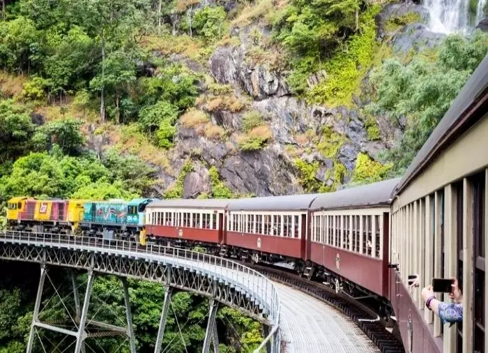 Togturen fra Cairns til Kuranda er den dag i dag kanskje en av verdens vakreste togturer. Fra Cairns kravler det 100 år gamle, restaurerte toget opp til 327 meter over havet. 15 tunneler og 37 broer skal toget passere, og underveis er det utsikt til både regnskog og fosser. Togturen tar 3 timer – len deg tilbake og nyt den!