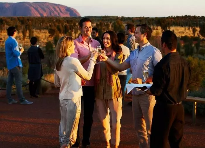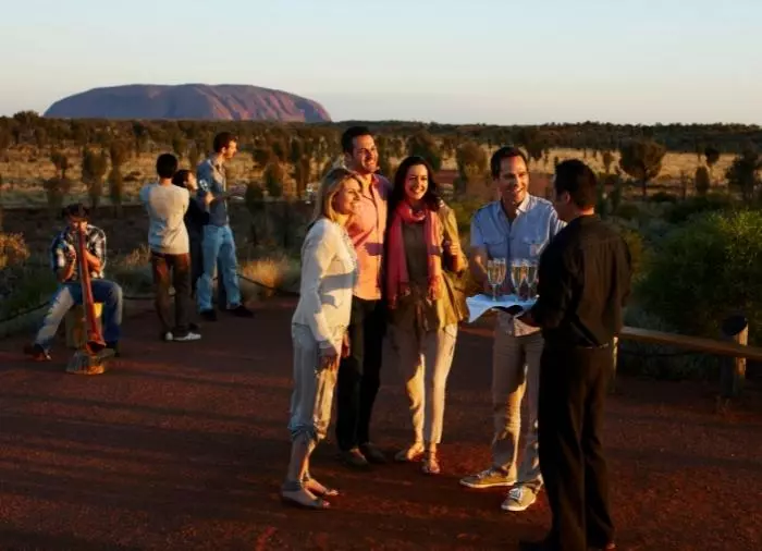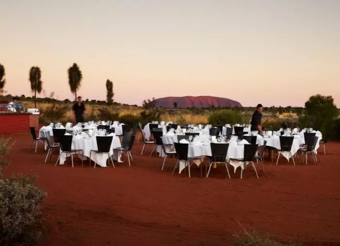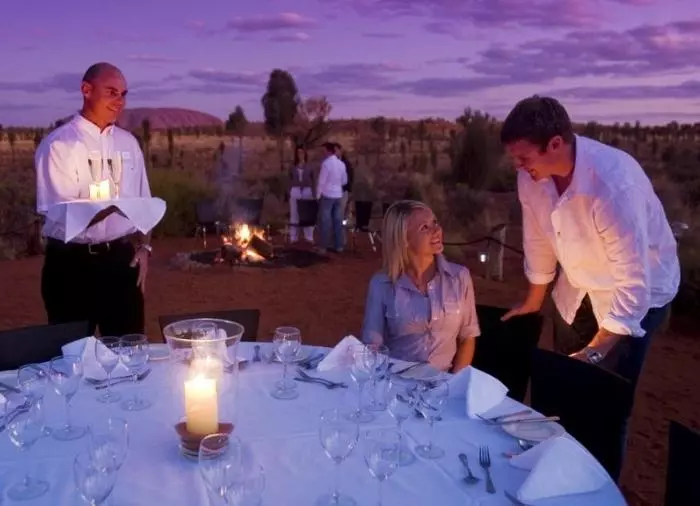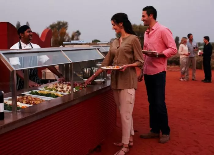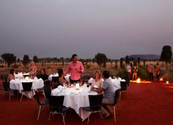 Nyt en middag under stjernene på den prisvinnende Sounds of Silence Restaurant. Midt i den australske ørkenen ønskes du velkommen med et glass sprudlende vin. Lyden fra en didjeridu lyder i bakgrunnen, mens solen langsomt går ned over Uluru. Når mørket er falt på, byr vertskapet på en smakfull australsk BBQ med mulighet til å smake på interessante australske spesialiteter. Middagen serveres som buffet, og maten inntas ved store bord med ca. 10 gjester ved hvert bord. Etter maten forteller en astronom om den mektige stjernehimmelen over deg.