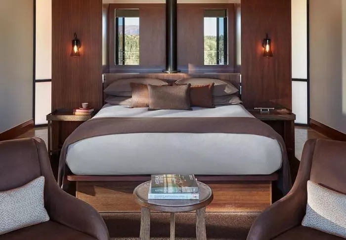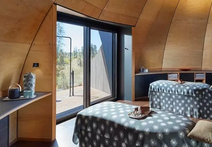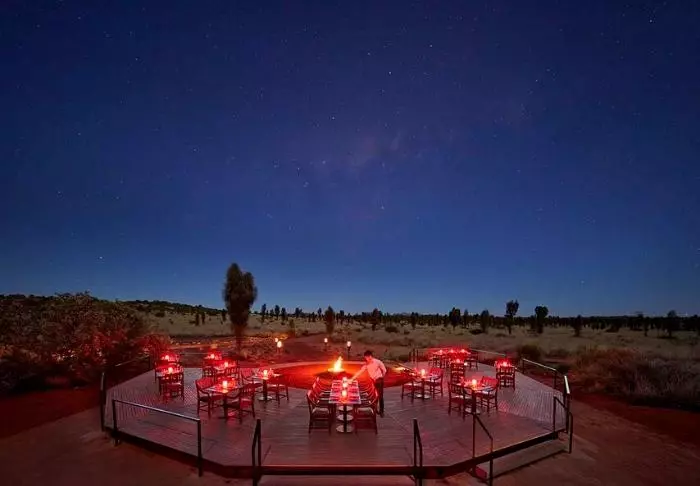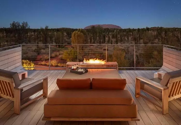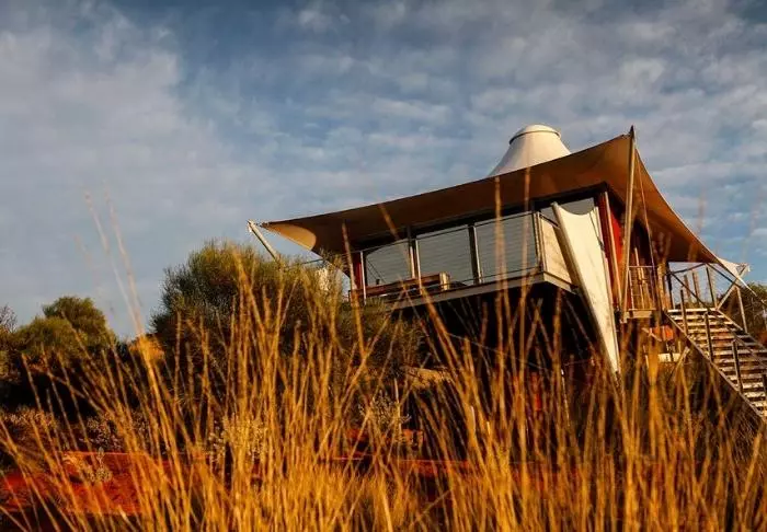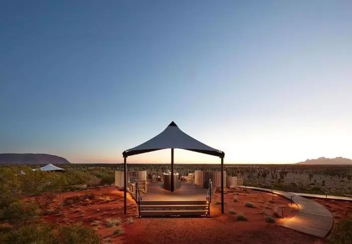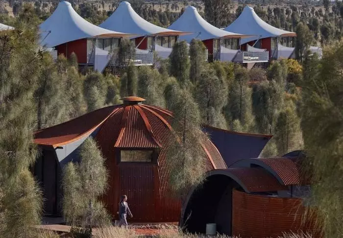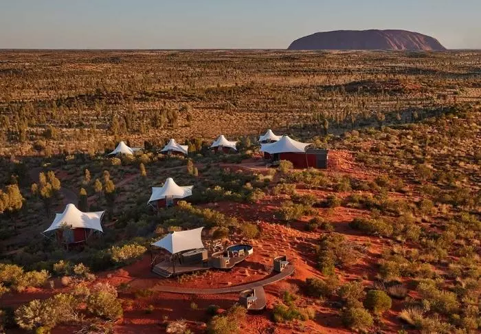 I alle fall bygninger som delvis er laget av teltduk. Her er det vinduer fra gulv til tak, med uhindret utsikt til Uluru. Takket er laget av lerret, slik at du likevel kan lukte naturen og høre lydene utenfor. Teltrommene er romslige og utrolig smakfullt innredet, og de har naturligvis alle tenkelige fasiliteter – som fjernstyrte gardiner, så du ikke en gang behøver å forlate sengen om morgenen for at se om solen er stått opp over Uluru. Alle de 15 teltene har sin egen store veranda med day-bed, og der kan du slange deg med utsikt til kjempesteinen – eller tilbringe natten under stjernene.