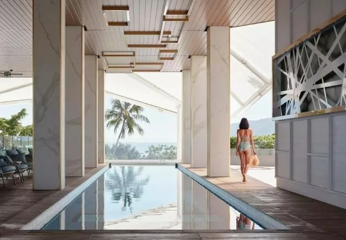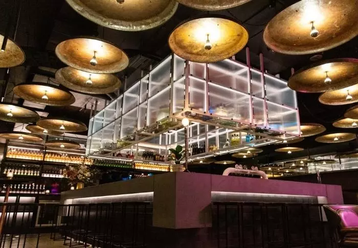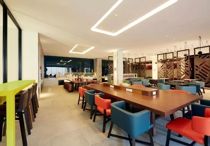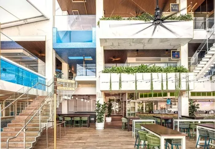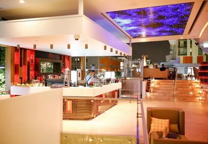 Du finner restauranten i første etasje, mens poolen ligger i tredje etasje under delvis åpen himmel.