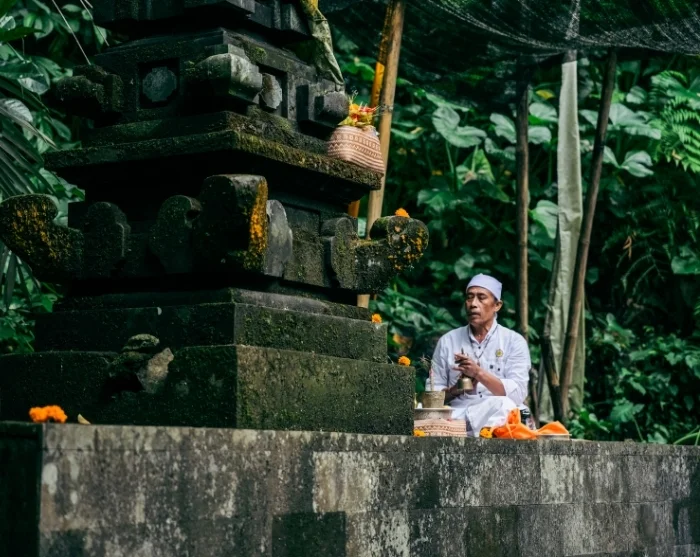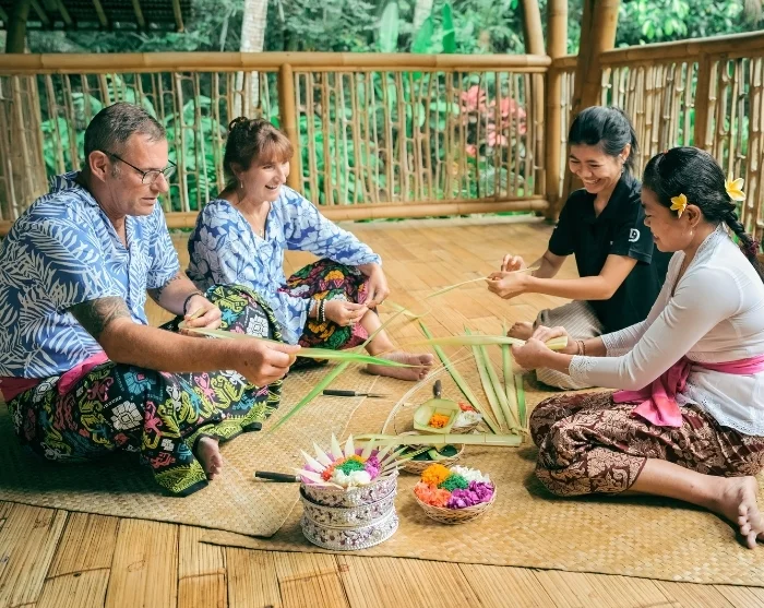 Opplevelsen starter med en varm velkomst fra lokale kvinner i landsbyen Manggis, som introduserer deg for fremstillingen av tradisjonelle balinesiske offergaver. Underveis forteller de om symbolikken bak de enkelte elementene og viser hvordan offergavene inngår som en naturlig del av hverdagen og de religiøse ritualene på Bali. Det er et nært møte med lokale tradisjoner og fellesskapet de springer ut av.