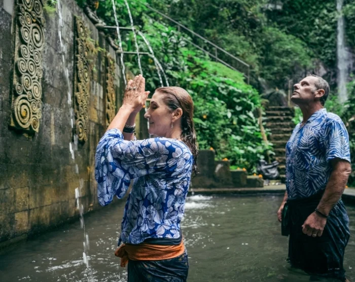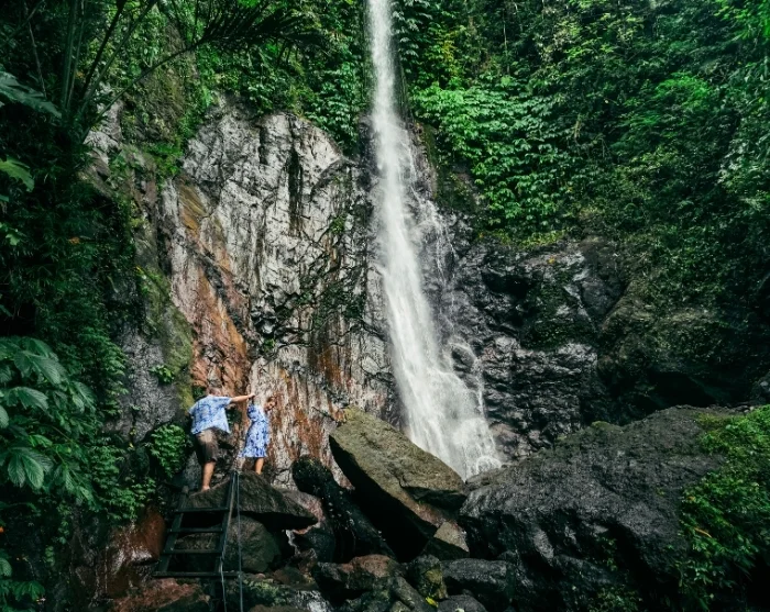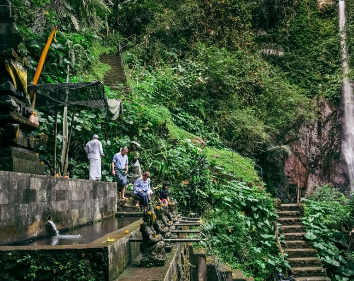 Deretter går turen mot Jagasatru-fossen. Du blir kjørt til en nærliggende parkeringsplass, og derfra er det en kort vandring på ca. 300 meter ned til fossen. I de rolige, grønne omgivelsene deltar du i en tradisjonell renselsesseremoni, der vannets bevegelse og naturens lyder skaper rom for ro og fordypelse. Seremonien gir et innblikk i balinesernes spirituelle praksis og deres nære forbindelse til naturen.