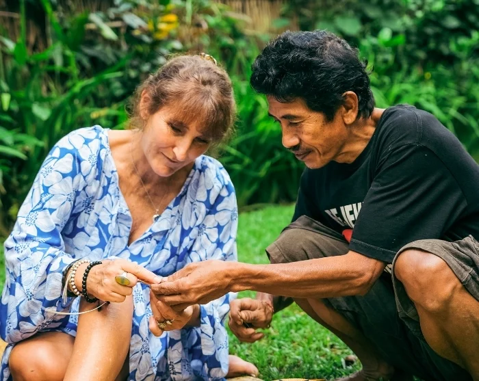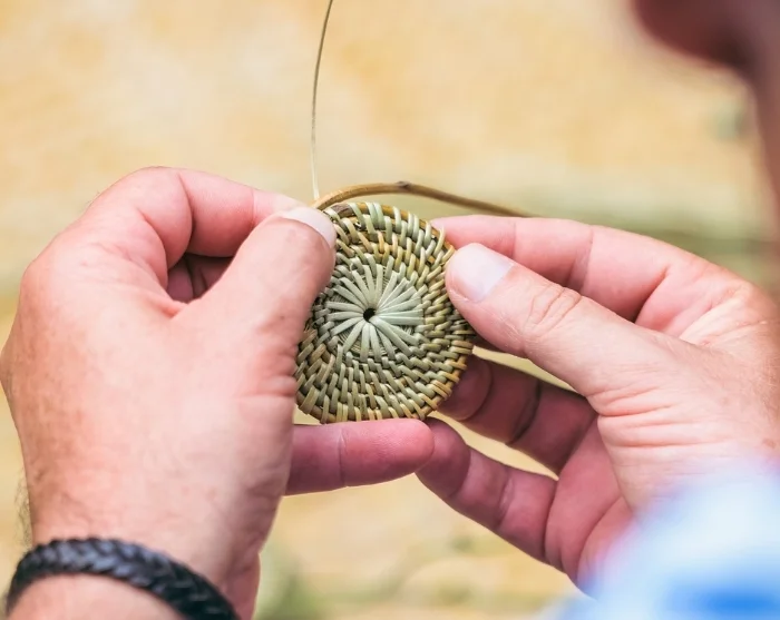 Arbeidet utføres med hata-tre, en rankelignende og fleksibel fiber som i århundrer har vært brukt i balinesisk flettverk. Under tålmodig veiledning lærer du å forberede fibrene ved å skrelle, tørke og mykgjøre dem før du går i gang med selve flettingen. Det rolige, gjentakende arbeidet skaper en nærmest meditativ stemning, der fokuset naturlig samler seg om prosessen.