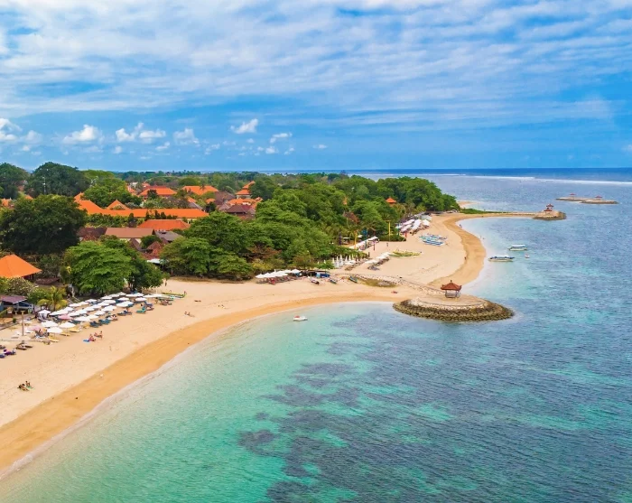ligger ved kysten i den sydøstlige delen av Bali og er en av Balis absolutt mest populære badebyer. Her finner du kilometervis av flotte sandstrender, så her har du det perfekte reisemålet for en fin badeferie. Stranden er beskyttet av et korallrev, noe som gjør vannet rolig og stranden utrolig barnevennlig.