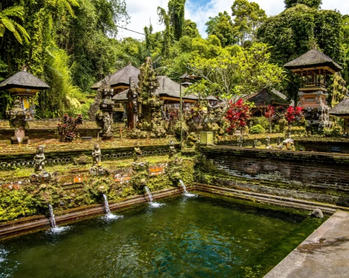 Turen går deretter videre til Sebatu-tempelet, også kjent som Pura Gunung Kawi Sebatu, som regnes som et av de mest fredfulle og spirituelle templene på Bali. Tempelet ligger vakkert til, omgitt av frodig jungel, og er bygget rundt en krystallklar kilde som sies å ha helbredende krefter. Her kan du oppleve en tradisjonell balinesisk vannrenselsesseremoni, hvor det hellige kildevannet symbolsk renser både kropp og sinn. Guiden din forteller om ritualets betydning og viser deg hvordan lokalbefolkningen stiger ned i de kjølige bassengene, sier en stille bønn og lar vannet renne over seg, mens du kjenner på stemningen av ro og fordypning.