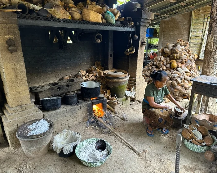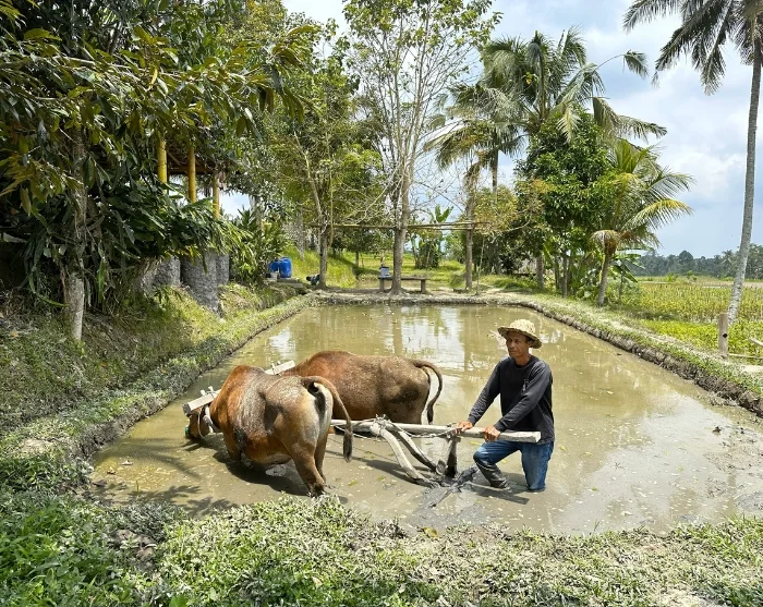 Etter frokost blir du hentet på hotellet og kjørt til landsbyen Rumah Desa, der du blir møtt av en lokal vert som vil vise deg rundt. Du får se og høre hvordan familiene bor, lager mat, bygger hus og driver landbruk, og hvis du har lyst, kan du selv delta i noen av aktivitetene. Du skal også vandre gjennom landsbyen med dens små hus, templer, den lokale skolen og et vakkert landskap med eksotiske planter og trær. På veien kommer du forbi flotte, irrgrønne rismarker, der du ser hvordan bøndene her bruker vannbøfler i arbeidet sitt. Du ser også hvordan man klatrer i kokospalmer og hvordan kokosolje utvinnes.