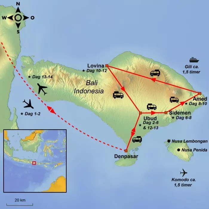 Bli kjent med Balis kunst og kultur i Ubud, opplev det uberørte landskapet i Sidemen, fantastiske snorkleparadiset Amed og avslutt i Lovina med de mørkglinsende vulkanstrender.