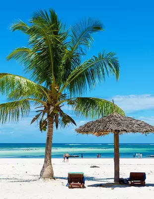 30 kilometer sør for Mombasa finner du Diani Beach, kjent som en av Afrikas vakreste strender. Her møter du kritthvit sand og turkisblått hav, omgitt av svaiende palmer.