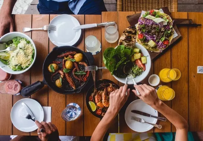 Det serveres mat i restauranten, ved hotellets egne liggestoler på strandpromenaden og ved svømmebassenget.