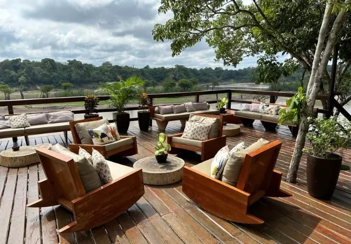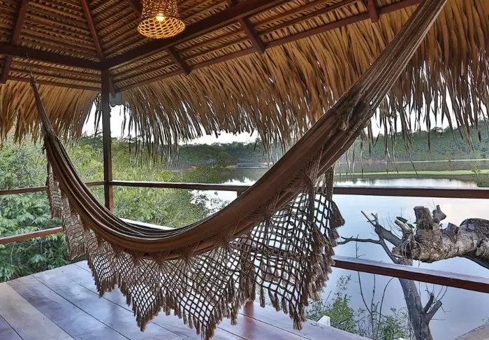 I en felles bungalow med hengekøyer kan du slappe av etter jungelopplevelsene og ta en drink fra lobbyens bar. Her er det også bøker og brettspill til fri benyttelse.