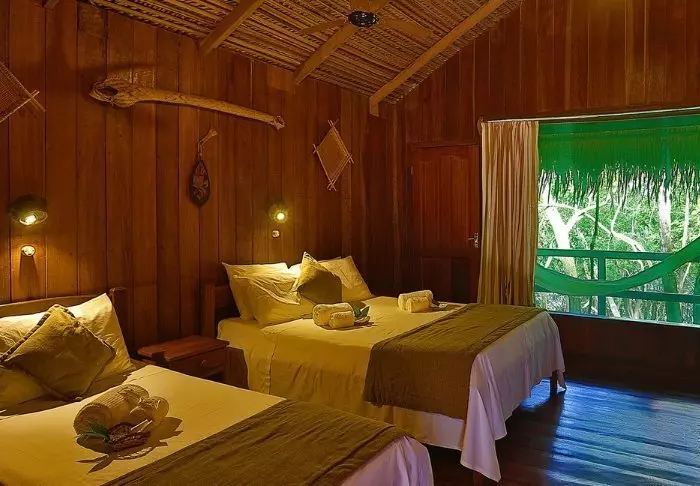Når du ankommer lodgen, vil du bli tilbudt en forfriskende velkomstdrink og få tildelt rommet ditt. Lodgen har bare 18 rustikke rom, og atmosfæren er koselig og innbydende. Rommene er bygget i lokalt treverk, som harmoniserer fint med den omkringliggende naturen. Rommene er enkelt møblert, men rene og pene, og de har alt du trenger: en seng, takvifte og eget bad med naturlig oppvarmet vann. I tillegg er vinduene utstyrt med myggnett, selv om den høye pH-verdien i Tupana-elven gjør det vanskelig for myggen å formere seg – noe som betyr at mygg ikke er et problem her det meste av året.