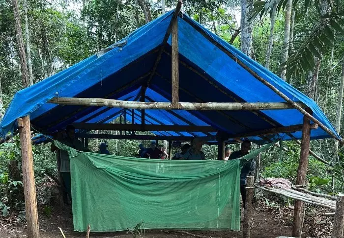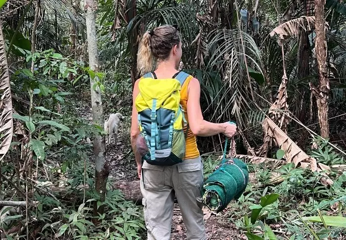 Sammen med guiden din og de andre gjestene fra lodgen vandrer du omtrent 15 minutter inn i jungelen til området der dere skal slå leir for natten. Der henger du opp hengekøya og myggnettet ditt under en presenning der du skal tilbringe natten. Du får også utlevert et teppe til natten.