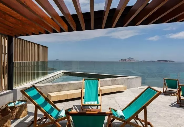 Hotellets svømmebasseng ligger også i øverste etasje, og her kan du ta deg en dukkert eller slappe av i en liggestol med utsikt over Copacabana.