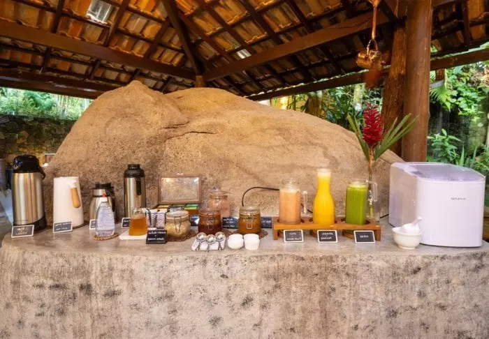 Frokosten serveres på rommet til ønsket tid, og du får bl.a. hjemmebakt brød, frukt og lokale lekkerbiskener som f.eks. tapioka-pannekaker.