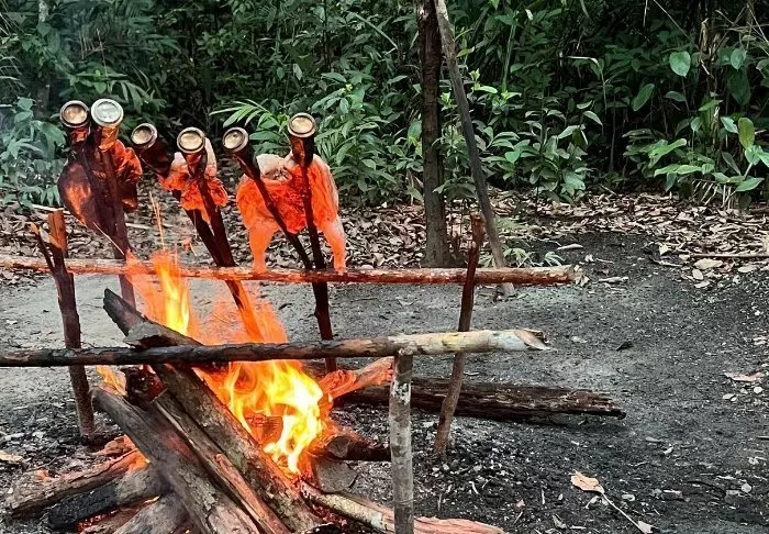 Om kvelden lager dere middag sammen, den stekes på bål og serveres på bananblader.