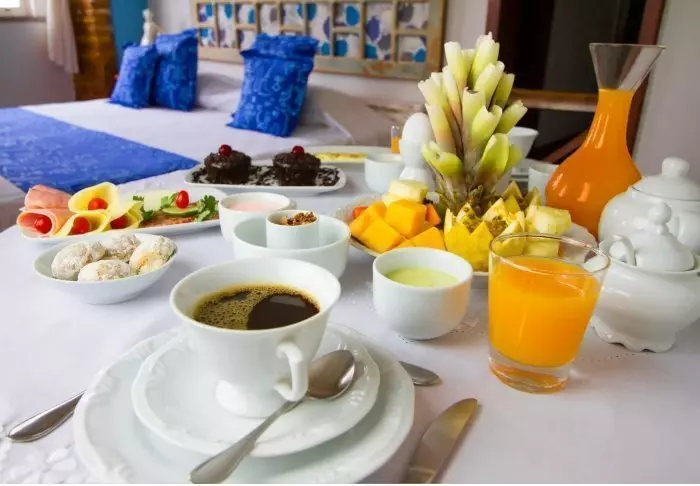 Frokosten serveres på rommet til ønsket tid, og du får bl.a. hjemmebakt brød, frukt og lokale lekkerbiskener som f.eks. tapioka-pannekaker.