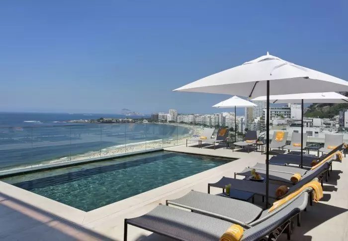 Hotellets svømmebasseng ligger også i øverste etasje, og her kan du ta deg en dukkert eller slappe av i en liggestol med utsikt over Copacabana.