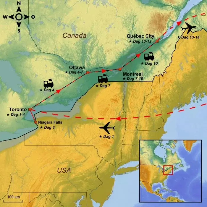 I dag starter reisen din til Canada. Du flyr fra den valgte flyplassen med mellomlanding underveis, og senere i dag lander du i Canadas største by, Toronto, som ligger i provinsen Ontario.