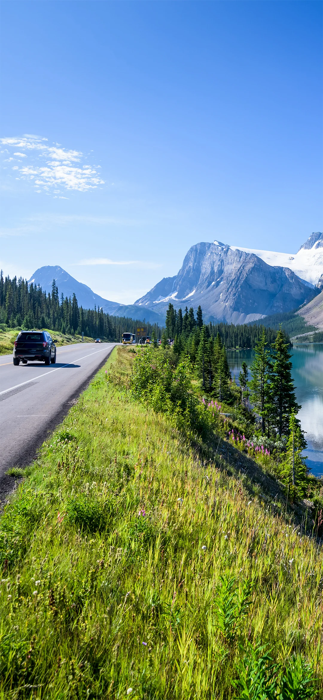 Merk at du i dag forlater British Columbia og kjører inn i Alberta-provinsen. Du krysser også inn i en ny tidssone: Alberta ligger én time foran British Columbia.