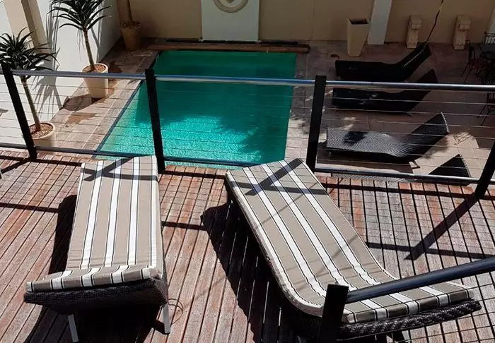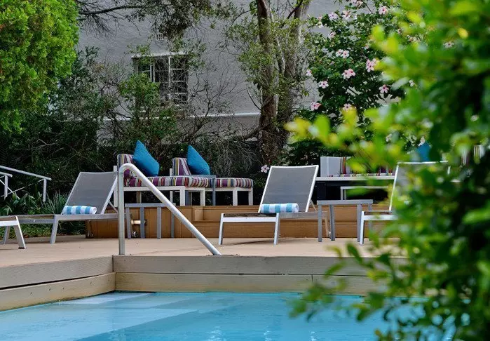 Fra basseng-området på det hyggelige 4-stjerners boutiquehotellet The Cape Milner har du en fantastisk utsikt mot toppen an Table Mountain. Så her vet du at du er i Cape Town!