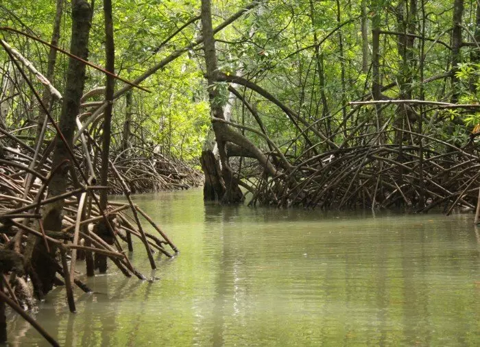 Så fører guiden deg på vannveiene gjennom den tropiske mangroveskogen, og den er full av liv. Mens du padler i skyggen av bladene fra de høye grønne trærne får du se alle de flotte mangrovetrærne med deres imponerende røtter og de eksotiske dyrene og plantene som lever blant trærne.