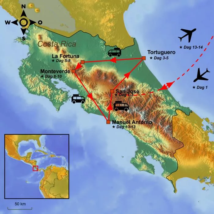 Reisen starter i Costa Ricas hovedstad San José og går videre til den frodige jungelen i Tortuguero nasjonalpark. Her er du omgitt av vakker natur og et spennende dyreliv, og transporten skjer i båt langs Tortugueros mange kanaler.
