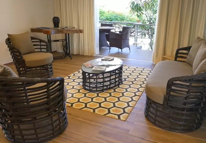 Hotellet har to etasjer, og rommene ligger rundt det store svømmebassenget og den frodige hagen. De er relativt små og enkelt innredet, men de har alt du trenger, med en komfortabel seng å sove i, aircondition, safe, kjøleskap og eget bad.