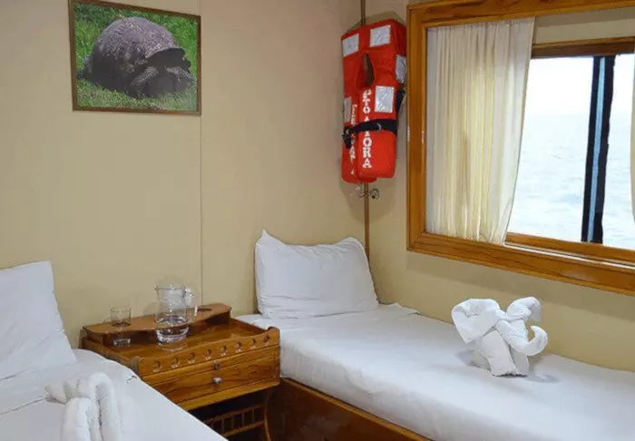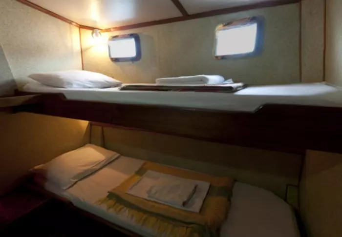 Båten har 9 kahytter med plass til 16 passasjerer, fordelt på 2 dekk. Kahyttene har enten to enkeltsenger eller dobbeltseng og har eget toalett og aircondition. Vi bruker de kahyttene som ligger på øvre dekk, der det er minst motorstøy.