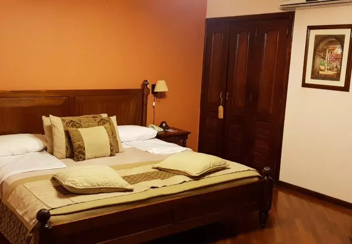 Hotellet har to etasjer, og rommene er bygget rundt to glassoverdekte bakgårder, noe som gir et flott lys og en helt unik sjarm. De 32 store rommene er innredet med vakre, mørke tremøbler, og alle har aircondition, safe, Wi-Fi og et fullt utstyrt bad med hårtørker.