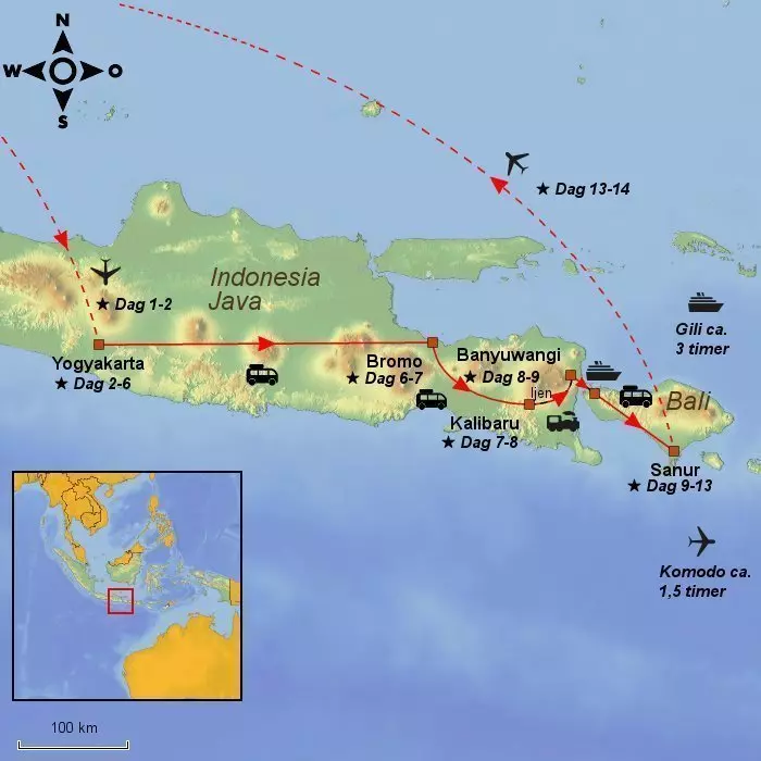 Java ligger på den indonesiske delen av ”ildringen”, rekken av verdens mest aktive vulkaner, og overalt på Java befinner du deg i et utrolig fascinerende landskap med vakre, nesten irrgrønne rismarker med imponerende, høye vulkaner i bakgrunnen. Du opplever landsbyer og byer som er mange hundre år gamle, noen av dem med brolagte gater og streder, andre i skyggen av 20 meter høye, lårtykke bambusplanter. Innimellom alt dette ligger flotte Borobudur, en av verdens aller største og aller vakreste buddhistiske helligdommer. Ikke langt derfra ligger også det praktfulle, hinduistiske tempelanlegget Prambanan. Du drar til den aktive vulkanen Bromo og går gjennom det legendariske ”sandhavet” til vulkanen. På turen rundt på Java får du også se krydder-, kaffe- og teplantasjer, opplever kontrastene mellom tradisjonell og moderne livsstil og møter en smilende og vennlig befolkning. Prikken over i-en på denne turen blir noen deilige, avslappende dager på Balis flotte strender i Sanur.