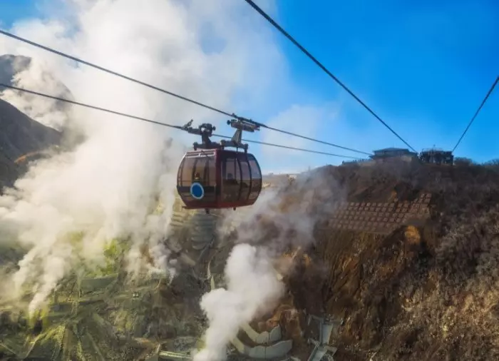 Du tar deretter kabelbanen fra Owakudani Station og ned til Togendai Station. Dette er den lengste kabelbanen i Japan, og det er glassvinduer på alle fire sider av gondolen, så alt er lagt til rette for å nyte naturens skjønnhet.
