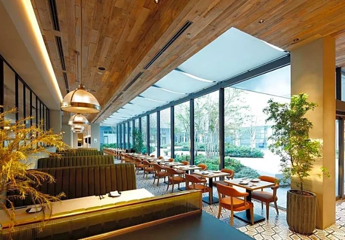 Oppholdet inkluderer en luksuriøs frokostbuffé i restauranten The Gate House, hvor japanske og vestlige favoritter tilberedes med nøye utvalgte, lokale råvarer. Her finner du også en dyktig barista som brygger fersk café latte på nyristede bønner. Restauranten ledes av kjøkkensjefen bak den anerkjente restauranten *L’AS* i Tokyo, noe som sikrer en smakfull og gjennomført start på dagen. Hvis været tillater det, kan du nyte frokosten i restaurantens stilfulle takhage – under åpen himmel og med utsikt over byen.
