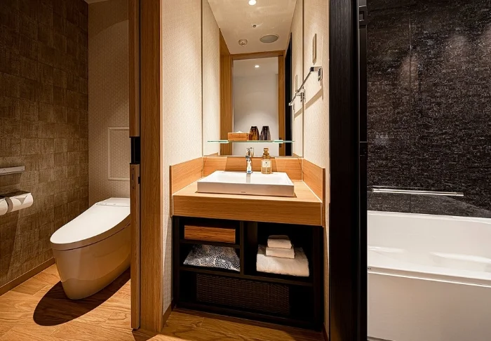 Som standard bor du i et Standard-rom med myk belysning og en harmonisk fargepalett. Sengen er spesialdesignet for ekstra komfort, og badet er innredet med separat dusj, servant og toalett. Rommet er ellers utstyrt med aircondition, WiFi, TV, minibar, vannkoker med japansk tesett, safe, hårføner samt et nøye utvalgt sett med toalettartikler, yukata og tøfler.‑Fi, TV, minibar, vannkoker med japansk tesett, sikkerhetsboks, hårføner samt et nøye utvalgt sett med toalettartikler, yukata og tøfler.