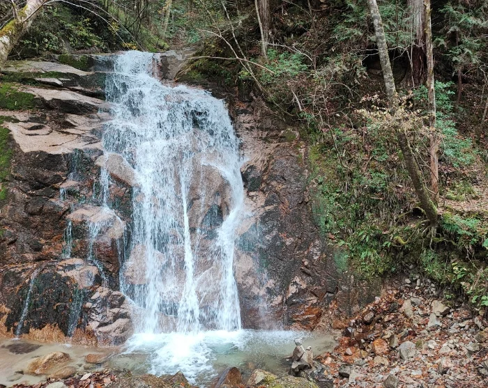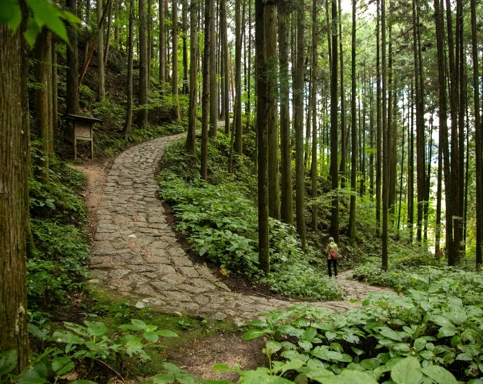 Med nye krefter tar dere turen til Magome Pass, det høyeste punktet på strekningen mellom Magome og Tsumago. Herfra starter vandringen nedover gjennom det vakre, kuperte landskapet. Du følger de samme stiene som samuraier og reisende har brukt i århundrer, går gjennom tette skoger med høye seder- og sypresser, passerer små fossefall og følger eldgamle steinlagte veier. Underveis stopper du ved et tradisjonelt tehus, der du kan hvile bena og nyte en pause i autentiske omgivelser.