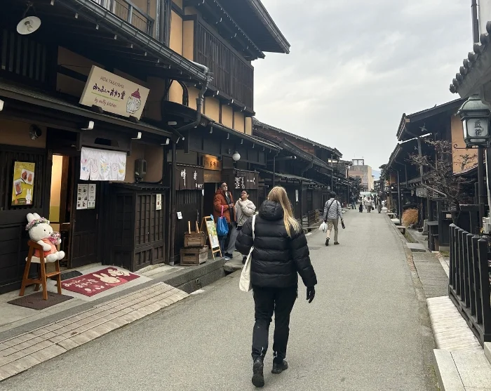 Deretter går turen tilbake mot byen og videre til det historiske distriktet Sanmachi. Her ligger de vakre, mørke trehusene tett langs gatene, og området oser av historie fra Edo-perioden. I dag finner du små butikker, håndverk og lokale spesialiteter langs de smale gatene, som innbyr til å utforske i rolig tempo. Underveis besøker du et lokalt sakebryggeri, hvor du kan smake Takayamas regionale sake, jisake. Her får du et innblikk i gamle bryggtradisjoner og en sanselig avslutning på byrundturen din, før du har kvelden på egen hånd.