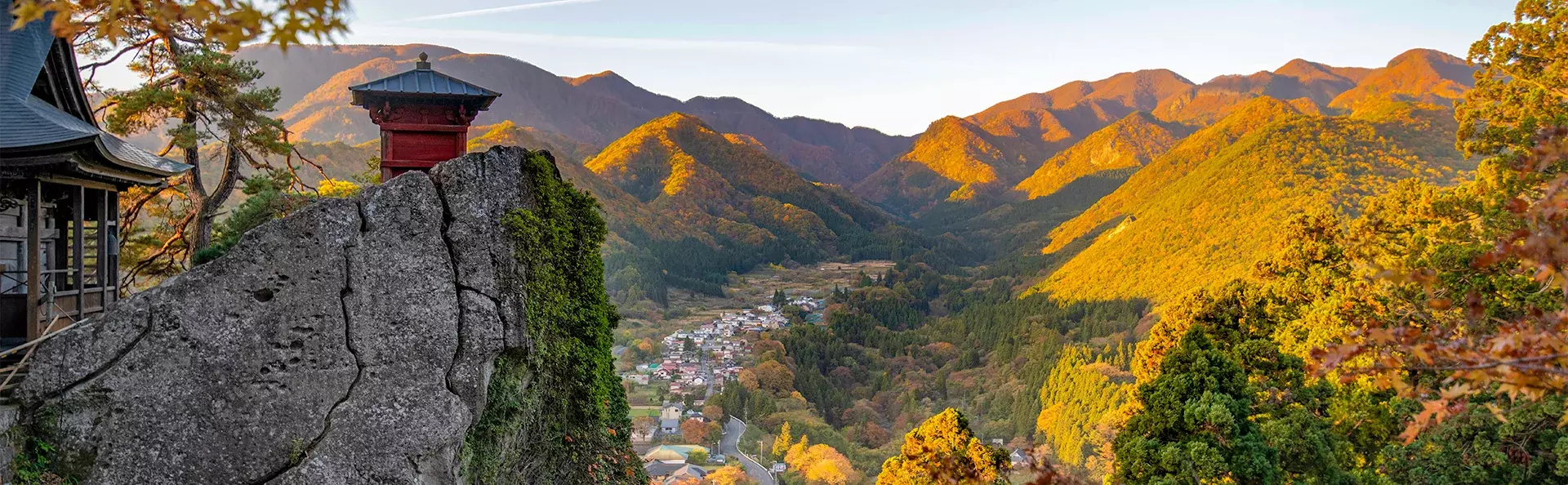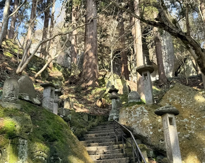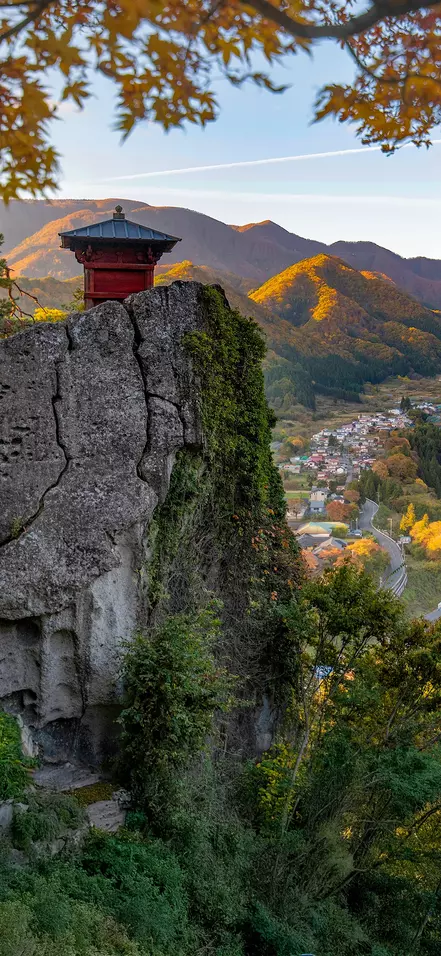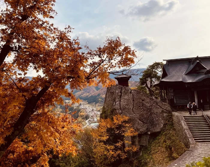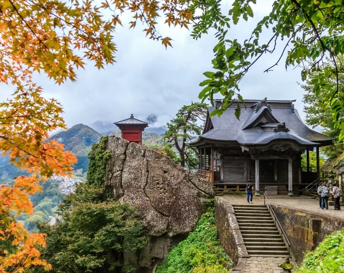 Fra stasjonen vandrer du opp mot Yamadera-tempelet, som klamrer seg dramatisk til fjellsiden. Du følger en sti med flere hundre steintrapper som munker og pilegrimer har tråkket på i århundrer. Trappene slynger seg gjennom eventyrlige omgivelser med høye sedertrær og en nesten urokkelig følelse av fred. Underveis passerer du små, mosegrodde helligdommer og utkikkspunkter der du kan trekke pusten og la blikket gli utover det storslåtte landskapet.