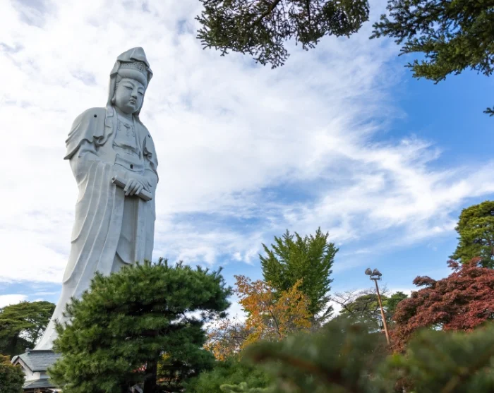 Alternativt kan du ta metroen til et annet av byens mest markante landemerker, Sendai Daikannon. Her reiser den enorme, hvite Kannon-statuen seg 100 meter over byen og vokter rolig over omgivelsene. Inne i statuen kan du vandre oppover flere etasjer med små helligdommer og buddhistfigurer, før du når utsiktspunktet på toppen. Kombinasjonen av historiske steder, lokale markeder og moderne landemerker gir Sendai en unik karakter, der kulturarv og hverdagsliv møtes på en harmonisk måte.