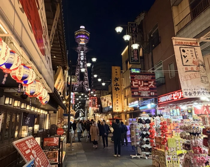 Turen starter i det sjarmerende Shinsekai-området, som da det ble oppført før andre verdenskrig, ble kalt “Den nye verden“. Arkitekturen og atmosfæren her bærer fortsatt preg av datidens fascinasjon for både Paris og New York, og gatene byr på en nostalgisk følelse av svunne tider. Her kan du smake de gyldne kushikatsu-spydene, både med kjøtt og grønnsaker – en av byens mest populære snacks.