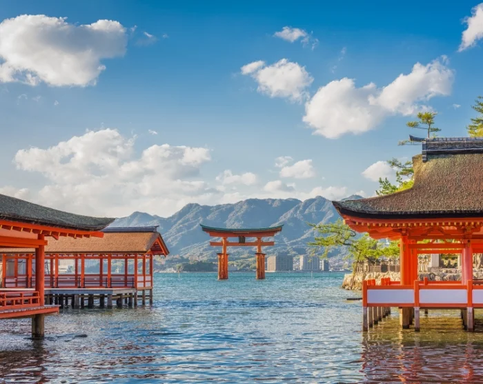 Turen fortsetter deretter med tog og ferge til den hellige øya Miyajima, som regnes som et av Japans mest naturskjønne og poetiske steder. Øya utstråler en helt spesiell ro med sine shintohelligdommer, buddhistiske templer og sjarmerende gater i Edo-stil, alt omgitt av frodig natur. Et naturlig høydepunkt er Itsukushima-helligdommen, der den ikoniske torii-porten, Otorii, under høyvann ser ut til å sveve over vannflaten – et syn som har gjort stedet til et av Japans mest fotograferte motiver.
