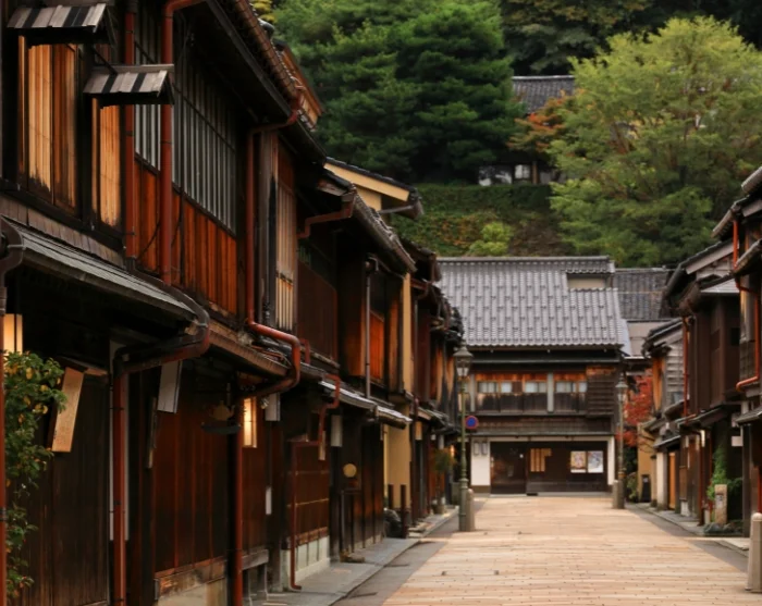 Hvis du fortsatt har energi igjen, kan du avslutte dagen med en spasertur i Kanazawas historiske geishakvartal, Higashi Chaya-distriktet. Når mørket senker seg, blir de smale gatene mykt opplyst av lanterner, og de godt bevarte trehusene fra Edo-perioden skaper en stemningsfull ramme for kvelden. Her senkes tempoet, og den rolige, elegante atmosfæren gir en følelse av å tre tilbake i tid. Kanskje hører du dempet musikk bak en skyvedør eller ser silhuetten av en geisha på vei til en avtale, mens byen sakte faller til ro.