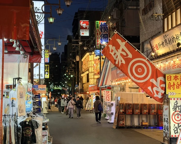 Turen starter i det sjarmerende Shinsekai-distriktet, som ved oppføringen før Andre verdenskrig ble kalt «Den nye verden». Områdets arkitektur og atmosfære bærer fortsatt preg av datidens fascinasjon for både Paris og New York, og gatene byr på en nostalgisk stemning av svunne tider. Her kan du smake de gylne kushikatsu-spydene i både kjøtt- og grønnsaksvarianter – en av byens mest populære snacks.
