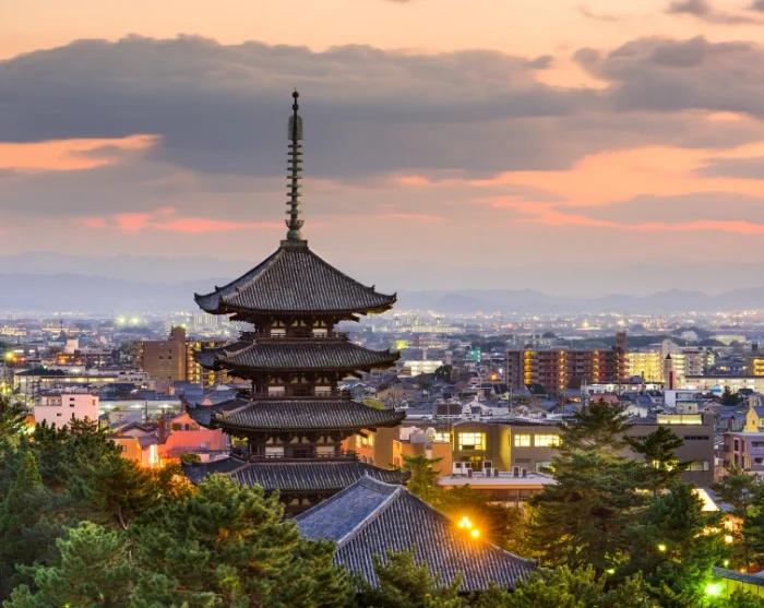 Ønsker du å utforske mer, kan du ta en tur utenfor sentrum til noen av Japans eldste og mest betydningsfulle templer, som Horyuji, Yakushiji og Toshodaiji – alle vitnesbyrd om landets tidlige buddhistiske historie. Alternativt kan du gå opp mot Mt. Wakakusa og inn i det vernede Kasuga Primeval Forest, hvor naturen omfavner deg og utsikten over Nara belønner innsatsen din.