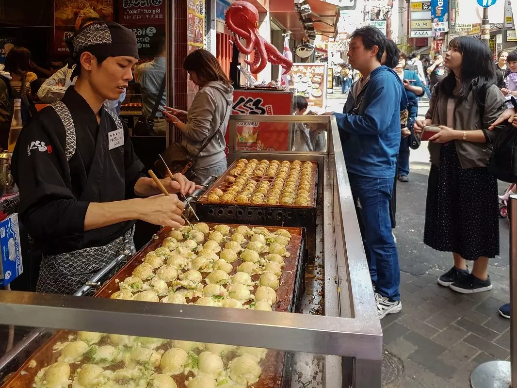 Om ettermiddagen bør du legge turen til det livlige og fargerike underholdningsområdet Dotonbori, et av Osakas mest besøkte steder. Her får du lett timene til å gå mens du beundrer de mange reklame- og neonskiltene, observerer menneskemylderet og vandrer rundt i labyrinten av butikker og de berømte matbodene. Hvis du har lyst til å prøve litt lokal mat, kan vi foreslå kushi katsu, stekte grønnsaker og kjøtt på spyd, eller blekksprutbollene takoyak. De ligner epleskiver, men smaker helt annerledes, for de er salte og inneholder blekksprut og purre eller vårløk.