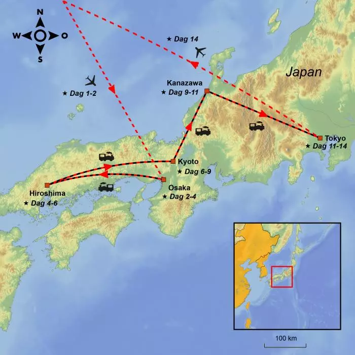 Opplevelsene starter i Osaka, som regnes for å være Japans matmekka. Deretter fortsetter du til Hiroshima, der du besøker Fredsminneparken og Atombombekuppelen. Japans hjerte finner du i den gamle hovedstaden Kyoto og i samuraiene maktsentrum Kanazawa, der du opplever det historiske Japan med gamle klassiske trehus og helligdommer, brolagte gater, geishaer og turister iført kimonoer. I Tokyo blir du i mer enn én forstand brakt tilbake til vår egen tid. Tokyo er dagens hovedstad og anses for å være Japans hjerne. Her er alt ultramoderne og trendsettende, byen har flotte skyskrapere og et meget effektivt transportsystem. For å komme deg raskt og enkelt rundt i landet kjører du med høyhastighetstoget Shinkansen eller vanlige hurtigtog. Det effektive togsystemet i Japan er nesten en severdighet i seg selv.