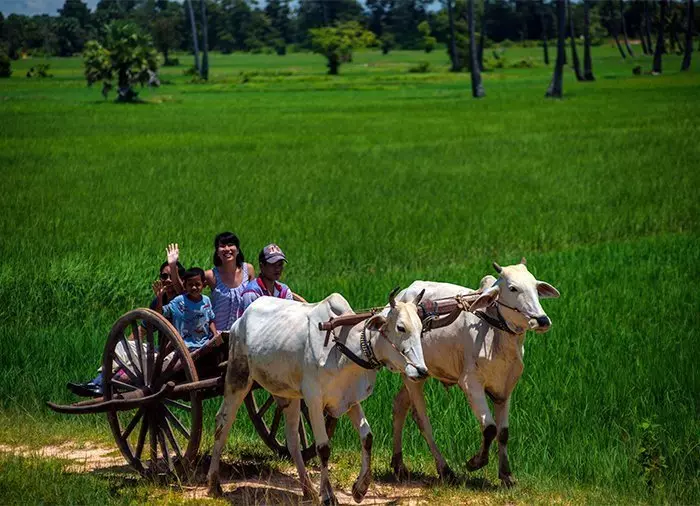 Båten fortsetter til den lille landsbyen Chansar, der du skal kjøre i oksekjerre og få en morsom humpete tur over jordene på vei hjem til en lokal khmerfamilie som lever av å lage koster. Du får se hvordan kostene produseres, og hvis du vil, kan du gjerne prøve deg som kostebinder selv.