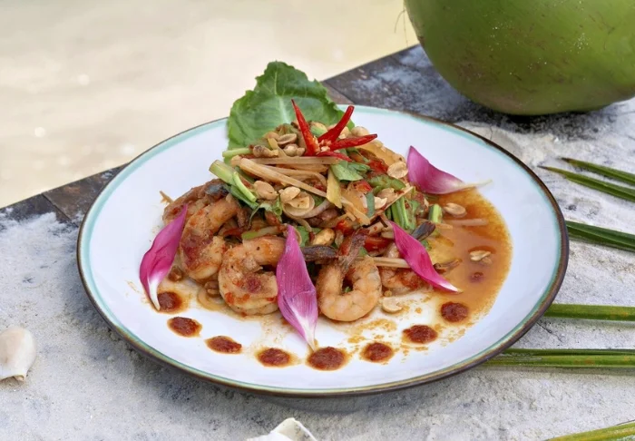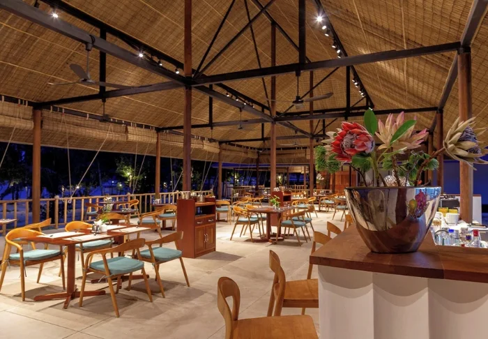 Resorten har sin egen restaurant, med en deilig meny med retter inspirert av både lokale og internasjonale favoritter. Av og til arrangeres det også temakvelder, for eksempel «BBQ-aften», med mulighet for en romantisk middag på stranden under stjernehimmelen.