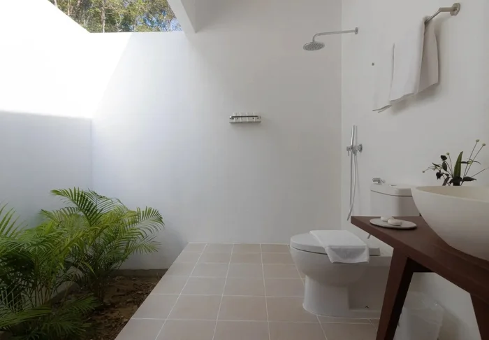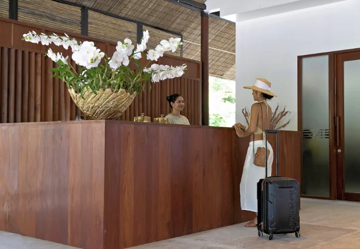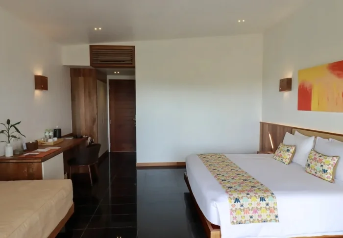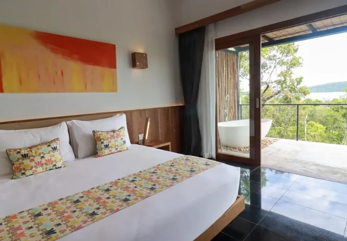 Som utgangspunkt bor du i et Deluxe Hillside-rom på 52 m2, høyt og tilbaketrukket i grønne omgivelser bak stranden. Beliggenheten gir rolige og private rammer for oppholdet. Du kommer hit via trapper gjennom det kuperte terrenget – en liten innsats som belønnes med vakker utsikt – men du kan også ta en buggy helt til rommet. Innredningen preges av varme trematerialer, rikelig med lys og en avslappet atmosfære. Store skyvedører åpner rett ut til en romslig terrasse med badekar og utsikt mot skog og Saracen Bay i horisonten. Her er det godt med plass til to personer, med enten en stor dobbeltseng eller to enkeltsenger – perfekt for rolige morgener. Rommet er utstyrt med aircondition, Wi-Fi, minibar, kaffe- og tefasiliteter samt skrivebord. Badet er delvis åpent og gir en særlig naturnær opplevelse, med både badekar og separat dusj.