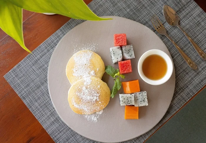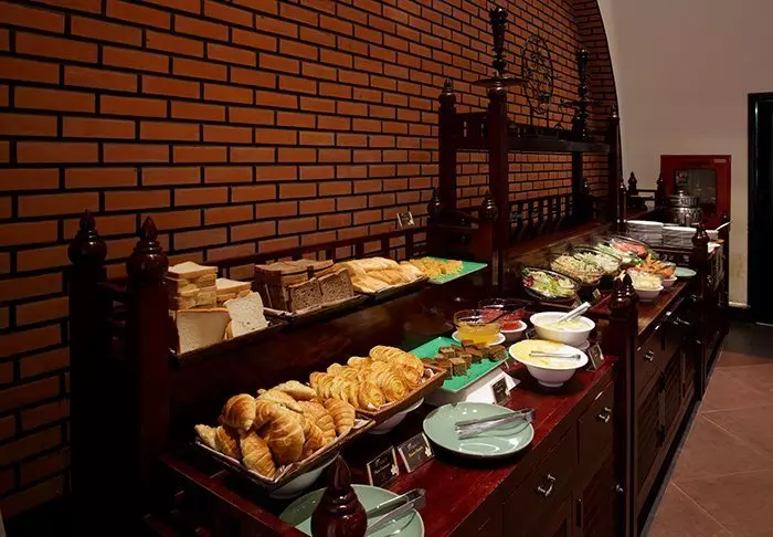 I hotellets restaurant, som har utsikt mot svømmebassenget, serveres det til frokost, middag og kvelds både asiatiske og vestlige retter.