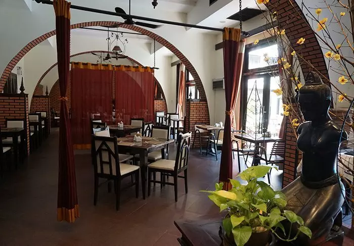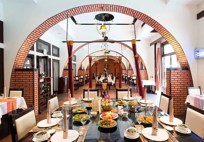 Den koselige restauranten ligger på en overdekket terrasse med utsikt mot hagen og svømmebassenget. Her trylles det frem lekre retter fra det kambodsjanske og internasjonale kjøkken både til frokost, middag og kvelds. Det finnes også et velassortert vinkart.